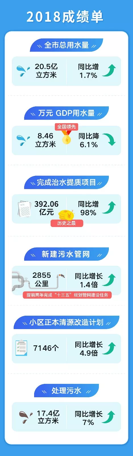 水资源保障能力持续加强!全市自来水水质综合合格率保持在99.9%!我们完成优质饮用水入户工程小区312个和120个供水管网改造工程社区,创建311个优质饮用水达标小区。