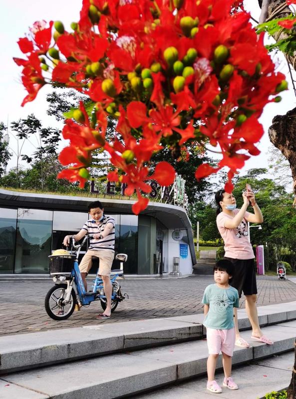 凤凰木又名火树、红花楹,由于其开花时"叶如飞凰之羽,花若丹凤之冠",因而得名「凤凰树」。每年5月至7月,是凤凰树开花的时节。在鹏城公园、道路两旁到处可见凤凰花盛开,当下凤凰花开正灿烂,锦簇花团红似火,成为鹏城亮丽的风景线。图为龙岗大运中心凤凰树花开吸引市观赏拍照。