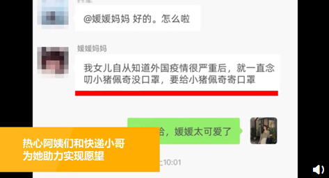 近日,三亚一小姑娘看到动画片里的小猪佩奇没戴口罩特别着急,于是嘱咐妈妈寄箱口罩给佩奇,还贴心地写了英文信嘱咐它。