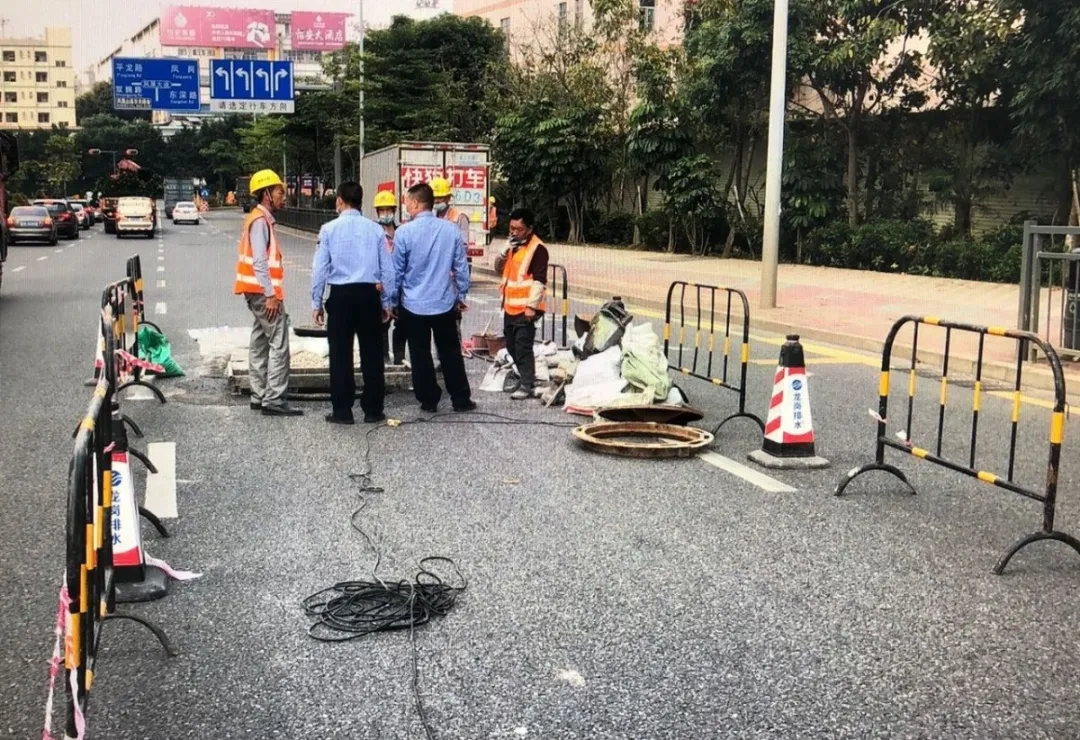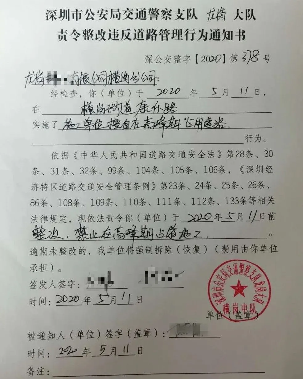 龙岗**有限公司横岗分公司擅自在高峰期占用道路施工,执勤民警责令立即整改、撤离现场。