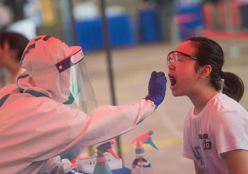 图:在武汉东西湖区一检测点,工作人员对市民进行核酸检测/新华社