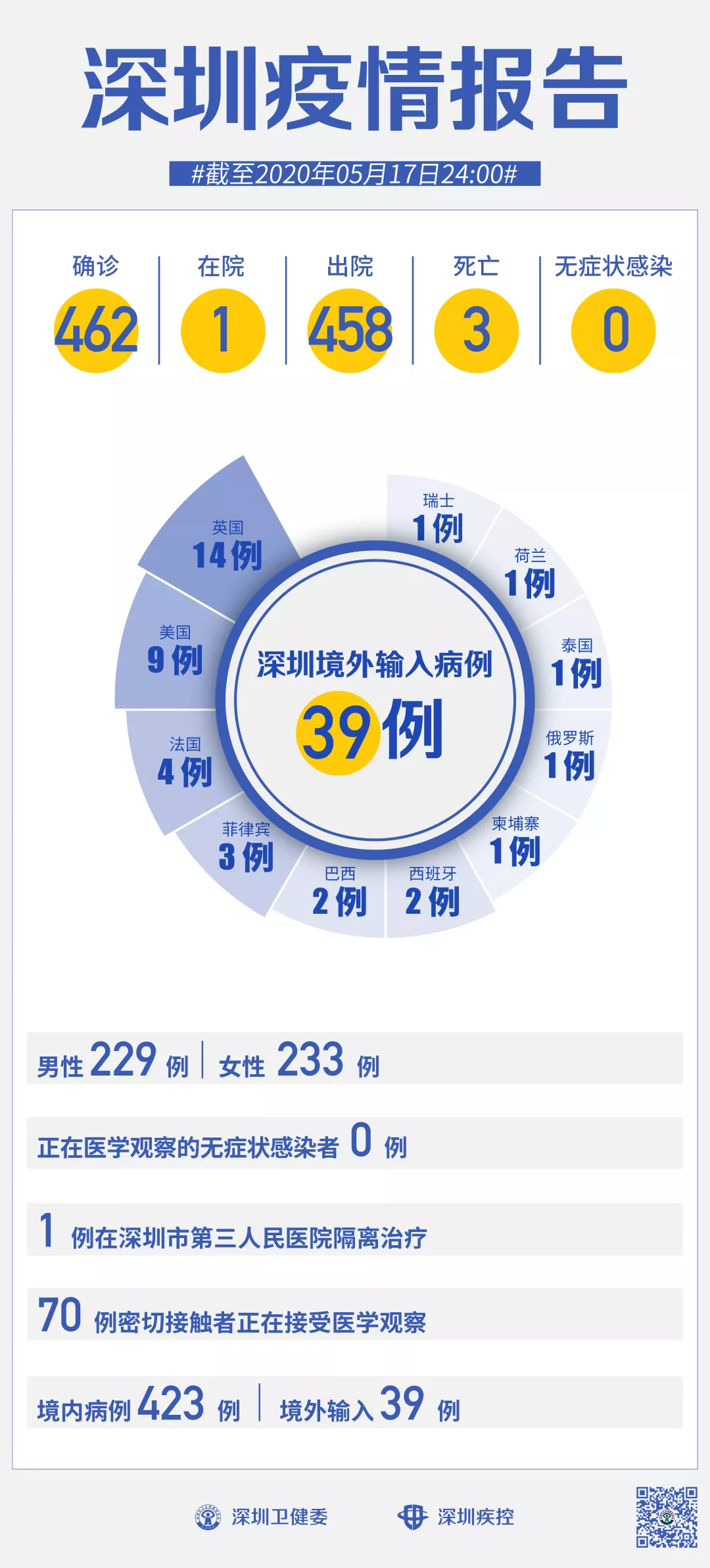 截至5月17日24时,深圳累计报告新冠肺炎病例462例。