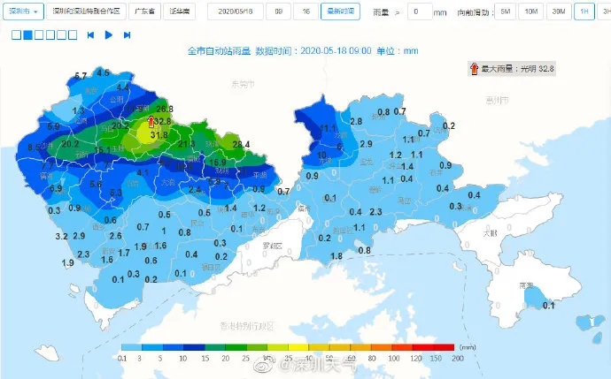 【深圳市分区暴雨黄色预警】预计福田区,罗湖区,南山区,盐田区,大鹏新区,西部海区,东部海区,宝安区(新安、西乡、航城街道),龙岗区(南湾、坂田、园山、横岗、布吉、吉华街道),龙华区(民治街道)和坪山区(马峦、碧岭街道)1-2小时内将出现20-40毫米降水,深圳市气象台于2020年05月18日15时50分在上述地区发布暴雨黄色分区预警,全市进入暴雨戒备状态,请注意防范。